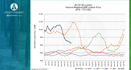 In August, the lumber futures price did not fall below the August 2021 $448 low. On September 1, the price of nearby futures was above that price, but the trend remained lower. The current environment favors a consolidation period, and … Continue reading →